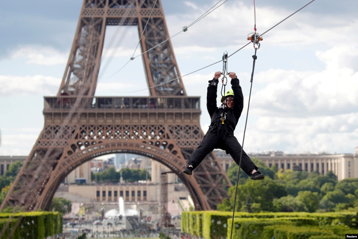 The zipline was set up by the French mineral water brand Perrier to celebrate the French Open and to coincide with the 130th anniversary of the Eiffel Tower.